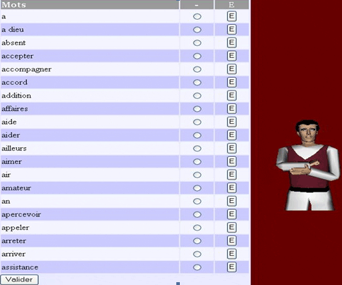 - إن برمجة الشخصية الافتراضية (L’avatar) لتجسيد الإشارات الخاصة بكل كلمة يتطلب مهارات عالية في البرمجة و الملتيميديا لذلك احتوت التطبيقة برمجية خاصة لبرمجة لغة الإشارة (Interface) لا تتطلب مهارات في البرمجة أو الملتيميديا بل تدريبا سهلا لاستعمال هذه البرمجية التي تعتمد أساسا على الفأرة لتحريك الشخصية الافتراضية و خزن الكلمة المترجمة إلى لغة الإشارة في القاموس.